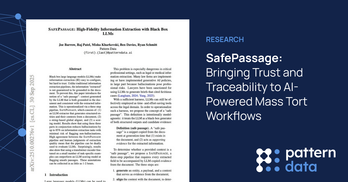 SafePassage is one more example of how research at Pattern Data connects directly to real-world legal workflows. It extends our commitment to pairing AI performance with evidence, transparency, and reliability — the foundation of any defensible case.